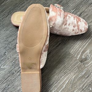 Size 8.5 pink velvet shoes with a a round jewel buckle. These shoes are extremely comfortable and soft. Includes new shoe box.