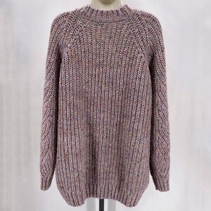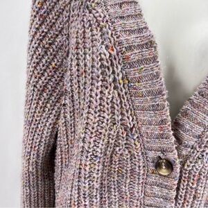 Light lavender/pink knit cardigan, multicolored bits mixed in, buttons down front, long sleeves