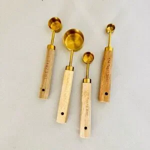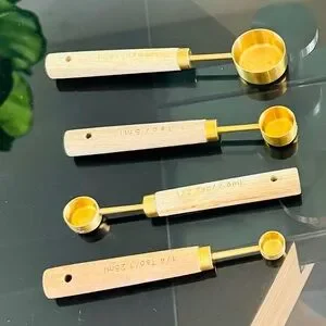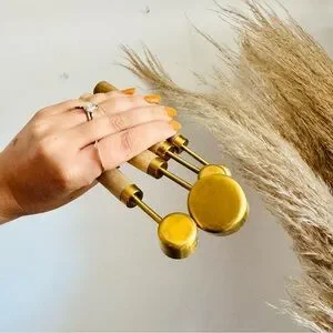 4 ANTHROPOLOGIE Gold Brass Metallic Cup Wood Handle Measuring Spoons Cooking Set