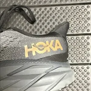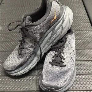 Sleek Hoka shoes with superior cushioning. Perfect for running and workouts. No wear on the soles. They are just too wide for my very narrow foot.