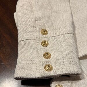 Chic Balmain blazer in ivory. Features bold gold buttons. Perfect for a polished look.