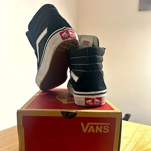 Stylish high-top sneakers for kids. Black canvas with white detailing. Iconic Vans design.
