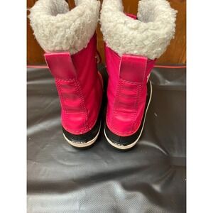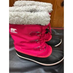 Women's Sorel snow boots in size 6, featuring a round toe, pink color, and waterproof design. It is perfect for casual wear during the winter season, with a rubber outsole for added durability and comfort. The faux sheepskin lining provides warmth and coziness, making it an ideal choice for outdoor activities in snowy weather. The stylish and functional design of these boots by Sorel is sure to keep your feet dry, comfortable, and stylish in cold and snowy conditions.