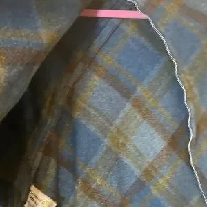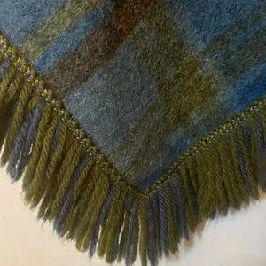 Elegant poncho with blue and green plaid pattern. Features fringe accents. Ideal for layering.