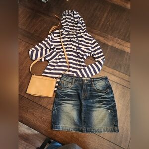 Stylish striped hoodie paired with a denim skirt. Includes a tan crossbody bag for a complete look.