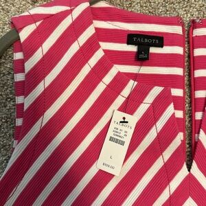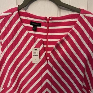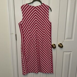 Sleeveless dress with bold pink and white stripes. Chevron pattern adds a stylish touch. Perfect for casual outings.