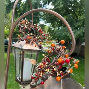 The wreaths are metal on the back and wrapped on the front and adorned with festive fall colors.