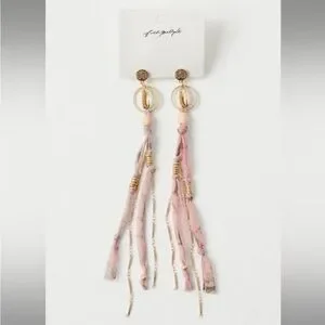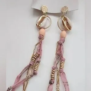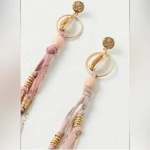 Elegant tassel earrings. Features pink fabric and gold accents. Perfect for a chic look.
