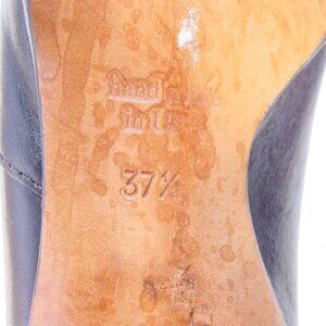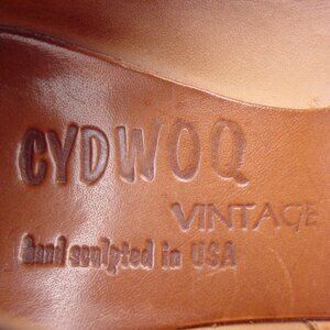 Vintage heels by Cydwoq, these stylish pumps have a signature look with asymmetrical toe and visible seams. In a very dark brown shade that looks almost black, this neutral is easy to wear with either color. Delicate straps cross at the toe. All leather construction except for the wood-grain plastic kitten heel. Hand made in the USA.