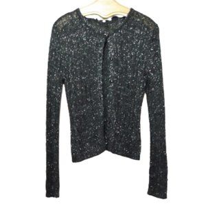 Black & metallic silver Carol Rose fuzzy loose cable knit long sleeve button down sweater size XL with faux diamond encrusted buttons