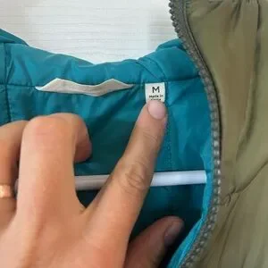 Stylish Cotopaxi jacket with a quilted design. Features green, teal, and blue panels. Perfect for outdoor adventures.