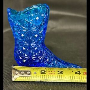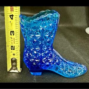 This Vintage Fenton Daisy & Button Blue Glass Boot Shoe figurine is a beautiful piece of North American art glass from the United States. Made by the renowned brand Fenton, this decorative pottery and glassware features a daisy and button pattern in a glossy blue finish. The shoe-shaped design adds a whimsical touch to any collection, making it a unique and charming vintage piece for glass enthusiasts.