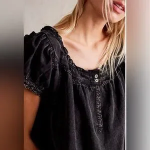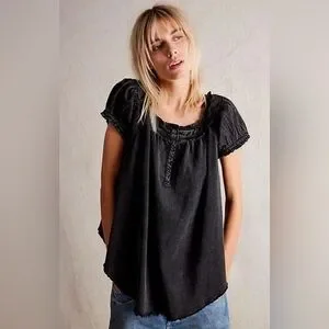 This effortlessly stylish We The Free Muse Tunic is the perfect blend of boho charm and casual cool. Designed in a washed black shade, this oversized tunic features a square neckline with delicate ruffle detailing, button accents, and puffed short sleeves with smocked cuffs. The raw hem adds a laid-back touch, making it a versatile wardrobe staple.