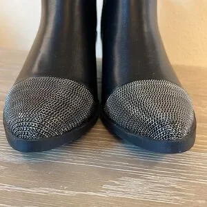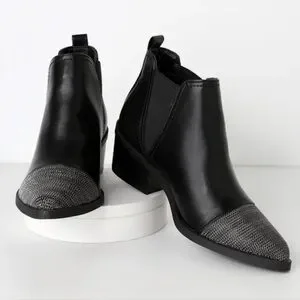 Take on the day with a little style in this Report Zerega Black Ankle Booties! Sleek faux leather booties with a unique chainmail overlay on pointed-toe upper. Gussets on both sides allow for easy on/off. The perfect 2 1/4” stacked leather heel. Lightly cushioned insole, and Felted rubber outsole with nonskid markings.
