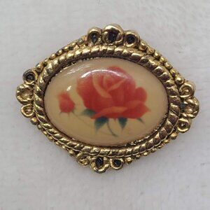 This charming vintage Camco brooch features a delicate oval centerpiece showcasing a beautifully detailed rose design in warm red and green hues, set against a cream background. The floral motif is encased in an intricately crafted gold tone metal frame with ornate scalloped edges and textured rope-like detailing, giving it a timeless elegance. The brooch measures approximately 1 inch in width, making it a perfect accent piece for any outfit.