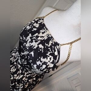 This european high-end designers stunning greek goddess style dress features a sleeveless halter neckline with golden chain detailing and in a striking black and white color scheme.