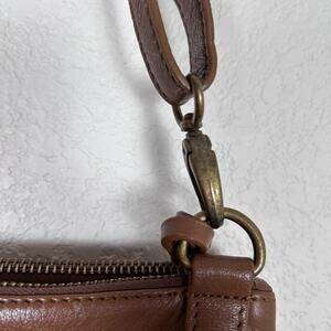 Gently used leather shoulder bag with adjustable strap. Three compartments 2 zip and 1 magnetic and fringe at the bottom. Please check the measurements so a return won’t be necessary. MWF shipping. Your satisfaction is important to me!