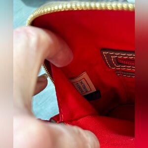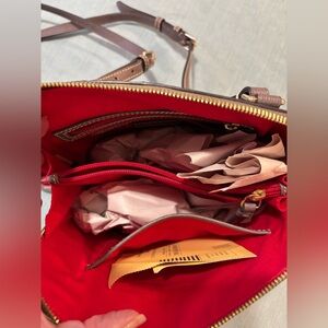 This Dooney & Bourke crossbody bag in smooth saffiano grayish brown leather, color called Elephant. Red interior lining, two inside zip pockets, two inside slip pockets, and overall zipper closure. The smooth durable leather finish will give you years of great use.