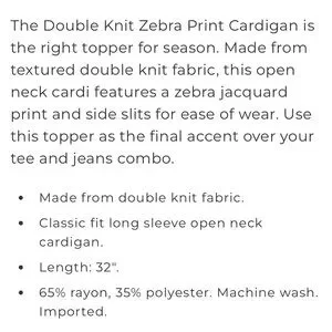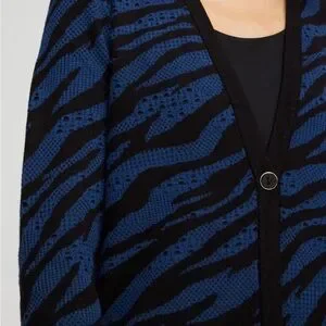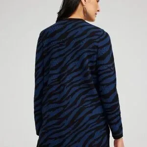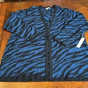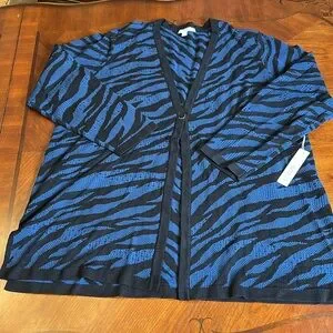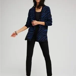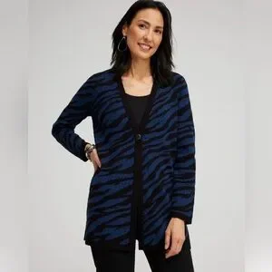 Chico’s cardigan sweater cool zebra. Color is called AZORES blue.