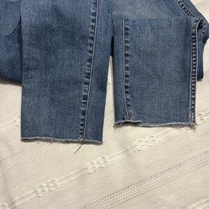 Stylish blue ankle jeans with distressed details. Features button fly closure. Perfect for casual wear.