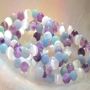 Beautiful 8 mm gemstone bracelet with Angelite, selenite and amethyst. 7 1/2”. Will be energetically charged by a Reiki Master✨✨✨