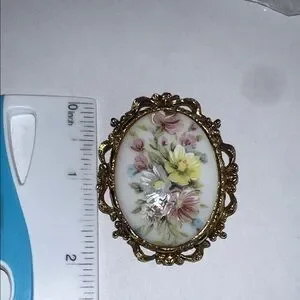 Elegant floral cameo brooch featuring a gold frame. Beautifully detailed with pink, yellow, and green floral design.