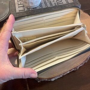 Stylish black and white striped wallet. Sleek design with zip closure. Perfect for everyday use.