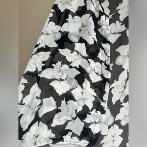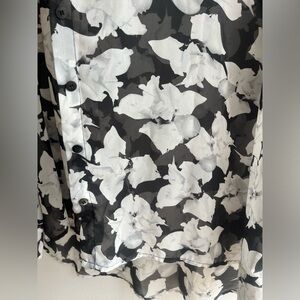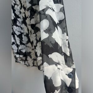 Flowy black & white floral printed chiffon layering top with button down front and cuffed sleeves. Ideal for versatile styling.