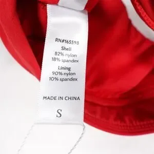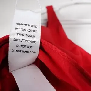Keywords: Andie Swim, bikini top, cherry red, women's swimwear, maximum support, removable cups, nylon spandex, hand wash, solid pattern, size small.