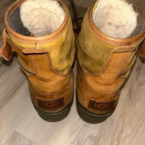 Stylish UGG ankle boots. Brown leather with tan accents. Lace-up design. Comfortable and durable.