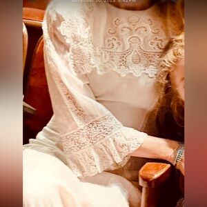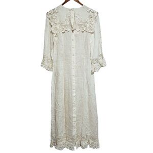 Elegant white maxi dress with intricate lace detailing. Features long sleeves and a classic round neckline. Perfect for a sophisticated look. From the DÔEN heirloom collection, beautiful thin Ramie/linen. Fits a size 6 and barely worn twice!