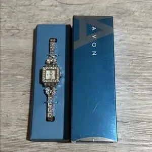 Stylish Avon watch featuring a silver band adorned with crystals. Elegant design with a classic face.