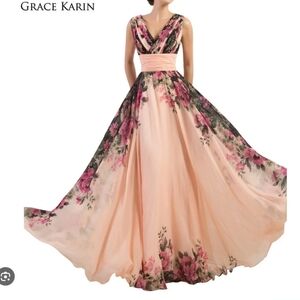 Chic floral print with a V-neck. Flowing chiffon . Ideal for special eventswedding,engagement, baby shower or any other occasion