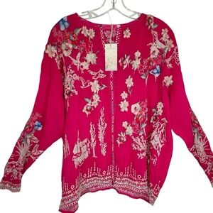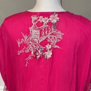 This blouse is an absolutely next-level piece of craftsmanship, bursting with detail and artistry. The vibrant fuchsia base provides the perfect backdrop for the elaborate, Asian-inspired embroidery that flows across the front, sleeves, and back. The floral motifs are lush and multi-layered, with delicate blossoms, graceful birds, and architectural elements—like a pagoda and ornate balcony—stitched in a soft, romantic palette. The scalloped embroidered hem and cuffs add refined structure, framing the free-flowing design with geometric precision.