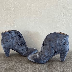 These crushed velvet booties have a cushioned footbed for comfort and an open slit in the front for a leg-lengthening effect. 3.25'' heel Cushioned footbed Textile upper Man-made sole Cone heel Split front opening Wide calf fit Size 8W Completely crushed blue velvet Only worn a couple of times, soles are super clean