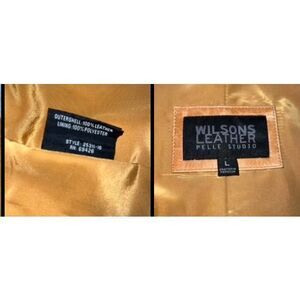 Wilsons Leather Duster Caramel Tan Trench Eyelet 70s Pearl Snaps Coat. Eyelet cutout patterns at Belle sleeves & pockets, as well as bottom hem. Thin, lightweight leather.