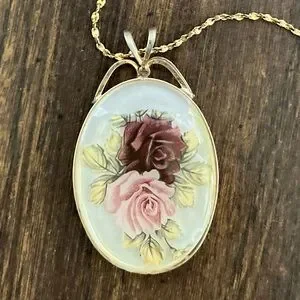This delicate vintage oval pendant necklace features a romantic floral design with two roses — one in soft pink and one in purple — set against a gold-toned drop frame. The pendant hangs from a 17-inch 14K gold-plated chain, adding just the right amount of shine.