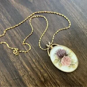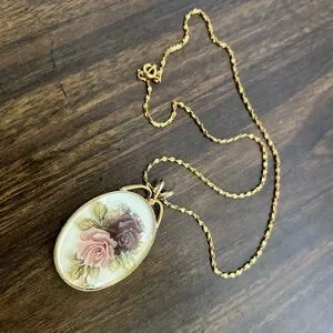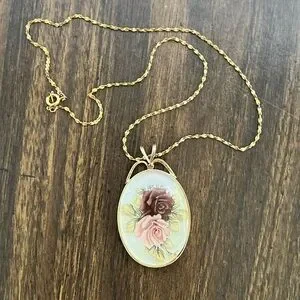 The pendant itself is costume jewelry quality, but with its timeless floral motif and warm gold tones, it makes for a beautiful everyday piece or a thoughtful vintage-inspired gift.