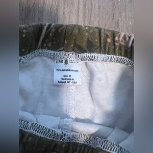 These stylish kids' bottoms feature a playful green pattern with brown accents, with animals as well. The inseam is 18" The material is 100% organic cotton.