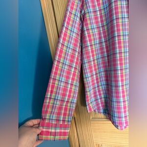 Bright plaid design with a mix of pink, blue, and green. Classic button-down style. Ideal for casual outings.
