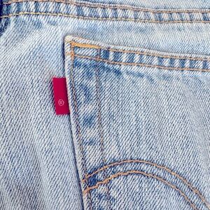 These Levi's blue jean shorts feature a stylish frayed hem and a classic cut-off design. Perfect for casual outings, they offer a timeless look with their light blue, stonewashed finish.