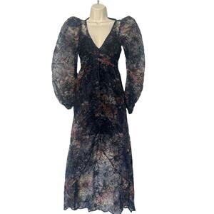 For Love & Lemons Sophia Sheer Puff Sleeve Midi Dress Black Navy Floral XS