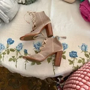 Stylish beige lace-up ankle booties. Perfect for versatile wear.