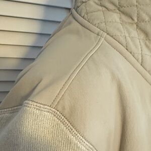 Chic utility jacket with a full zip front. Features quilted sleeve detail and multiple pockets. Last picture is cozy inside.