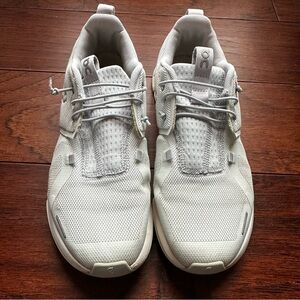 Sleek sneakers by On Running. Ideal for everyday comfort. They are in used condition with some discoloration from dirt but likely could look better with some cleaning (see last couple of pictures)