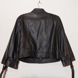 Unique and stylish crop leather jacket has wide belted sleeves so you can adjust the sleeve size. Zip close. Gold hardware. Stand-up collar. Two front pockets. Banded neckline and hem. 100% lamb leather, shell 100% poly. Condition: good, no flaws seen.