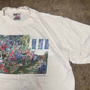 ONEITA POWER-T Mens XL White Graphic T-Shirt Vintage A Garden Story Floral Art 90s