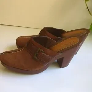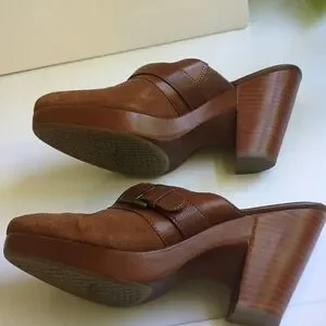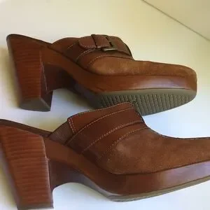 Elegant brown suede mules by Cole Haan. Features a stylish buckle accent. Perfect for any occasion.