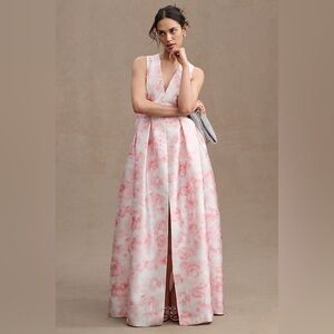 The Sachin & Babi Brooke Gown is a V-neck dress with box pleats, a peaked waist seam, and side pockets. The sleeveless piece is a classic, essential silhouette with a breathtaking print.