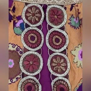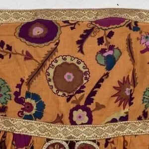 Beautiful strapless dress with intricate floral embroidery. Features vibrant colors and a unique design.